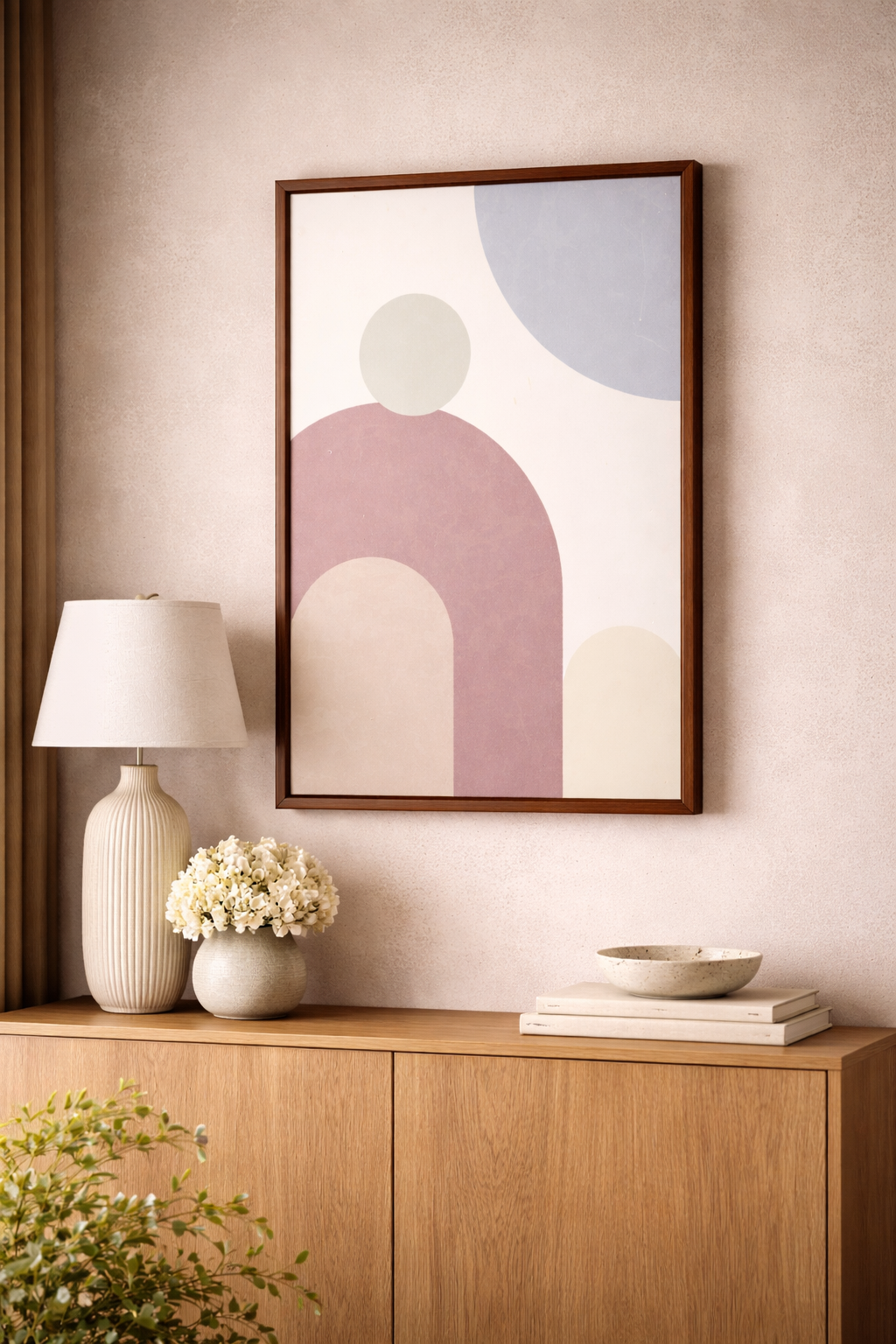Elevate your space with this refined abstract wall frame, designed to bring a perfect balance of modern minimalism and timeless elegance. Featuring soft geometric forms in muted tones of beige, blush, and grey, this artwork creates a calm, sophisticated visual statement that complements any contemporary interior.