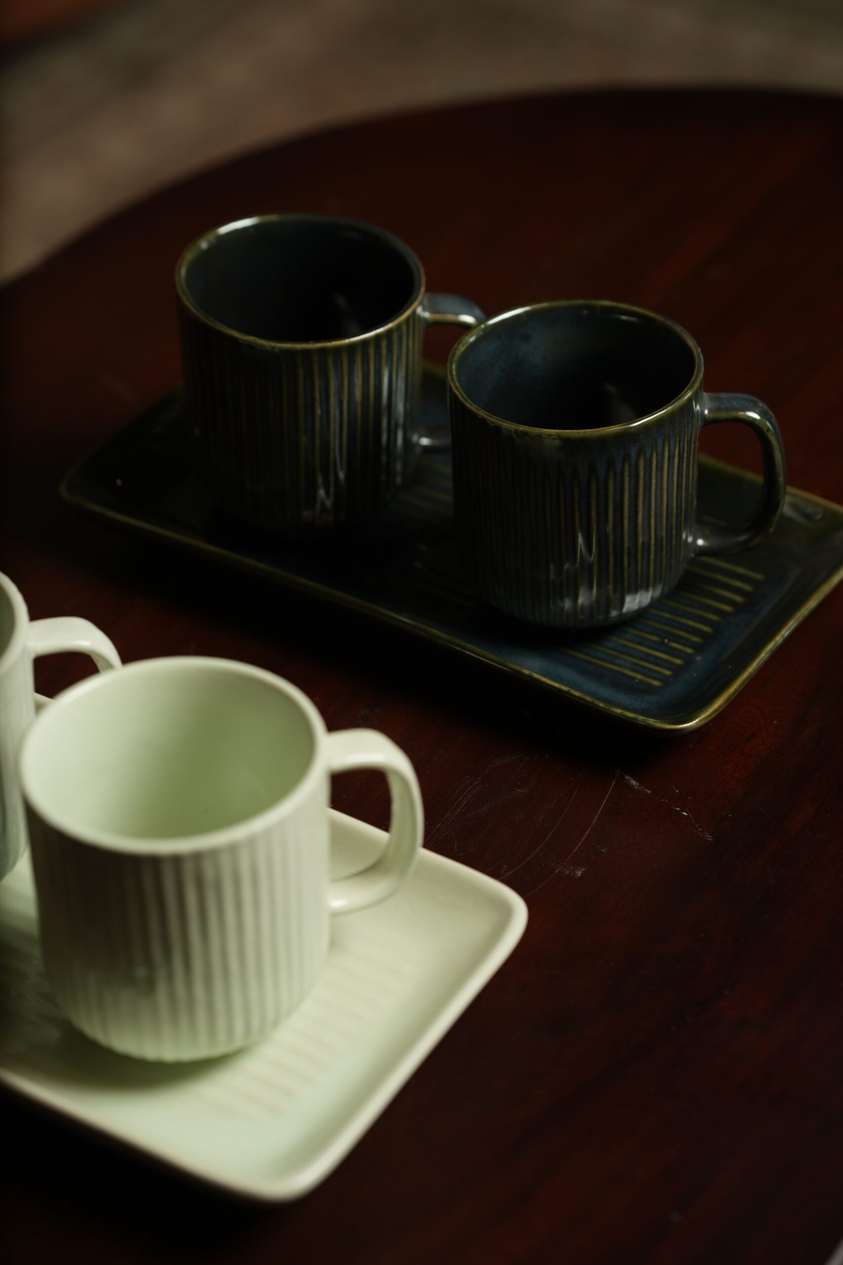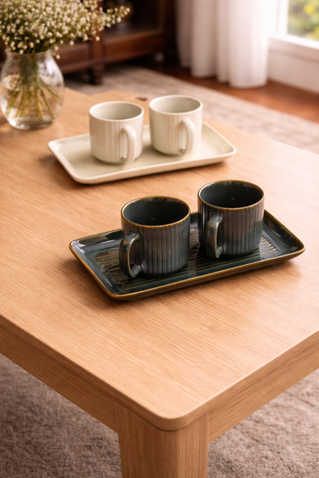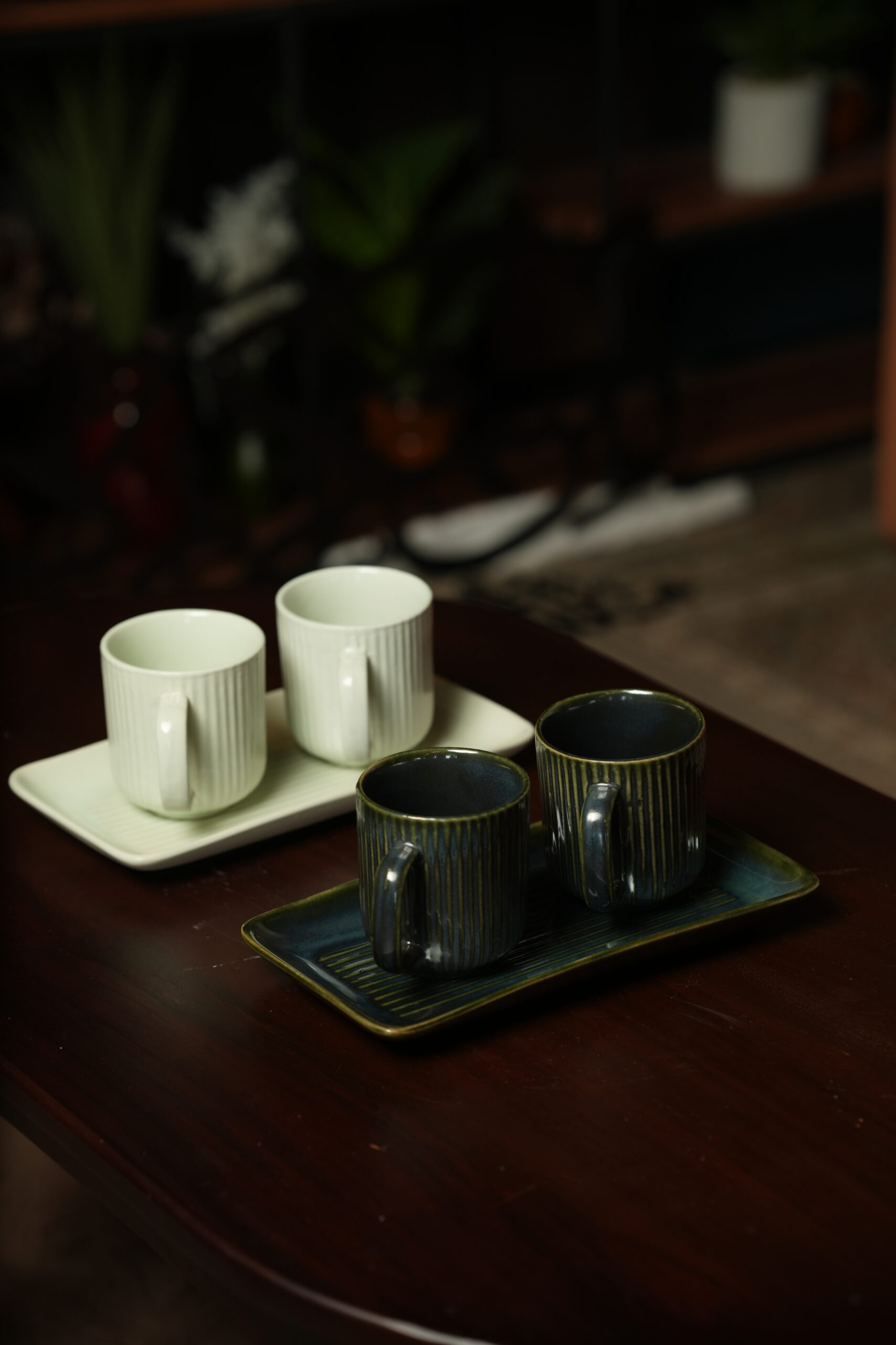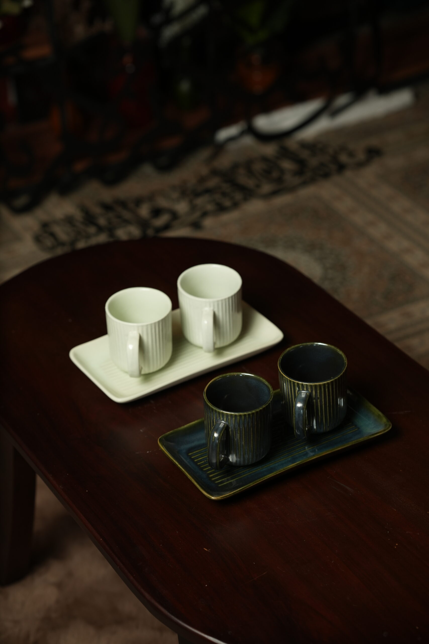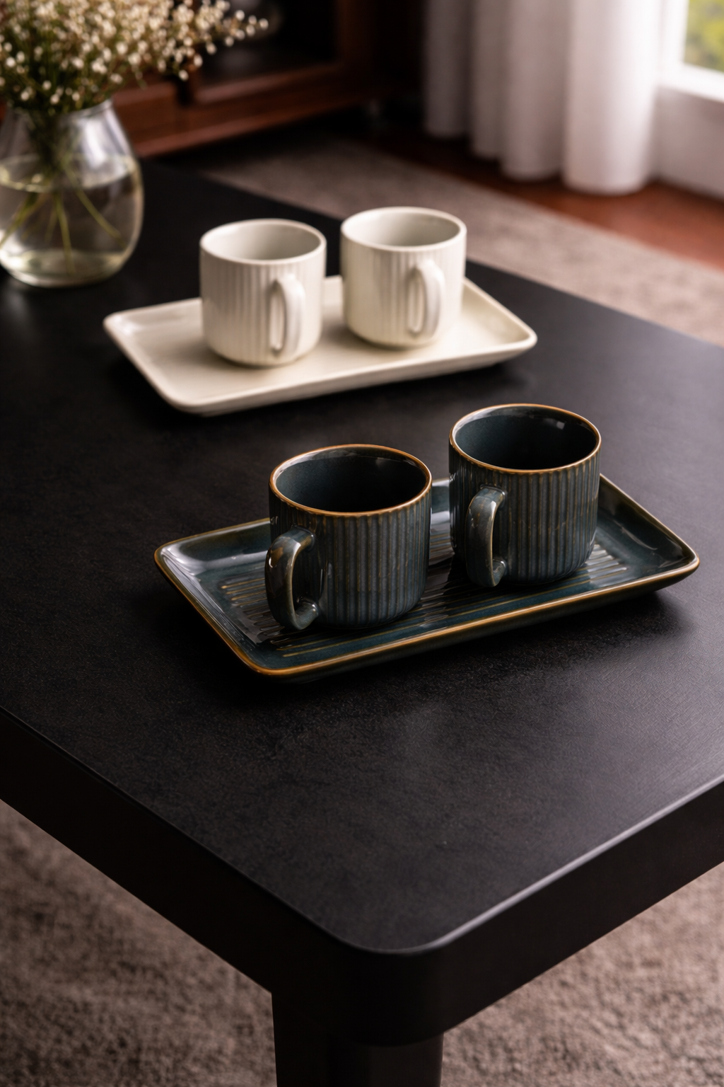 Each cup is crafted from high-quality ceramic with a ribbed texture for a comfortable grip, paired with a matching rectangular tray for a clean and organized presentation—perfect for both casual and formal serving.