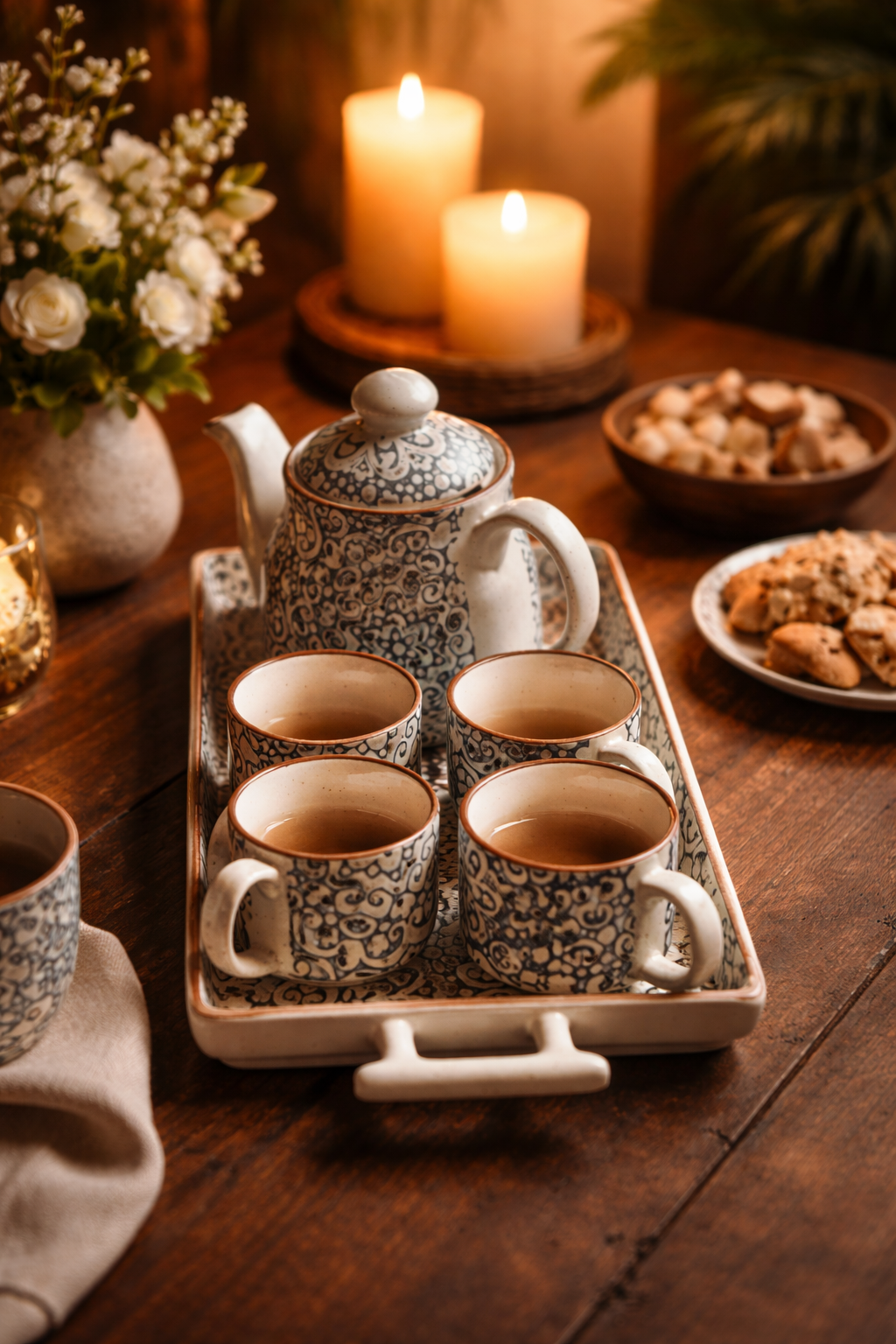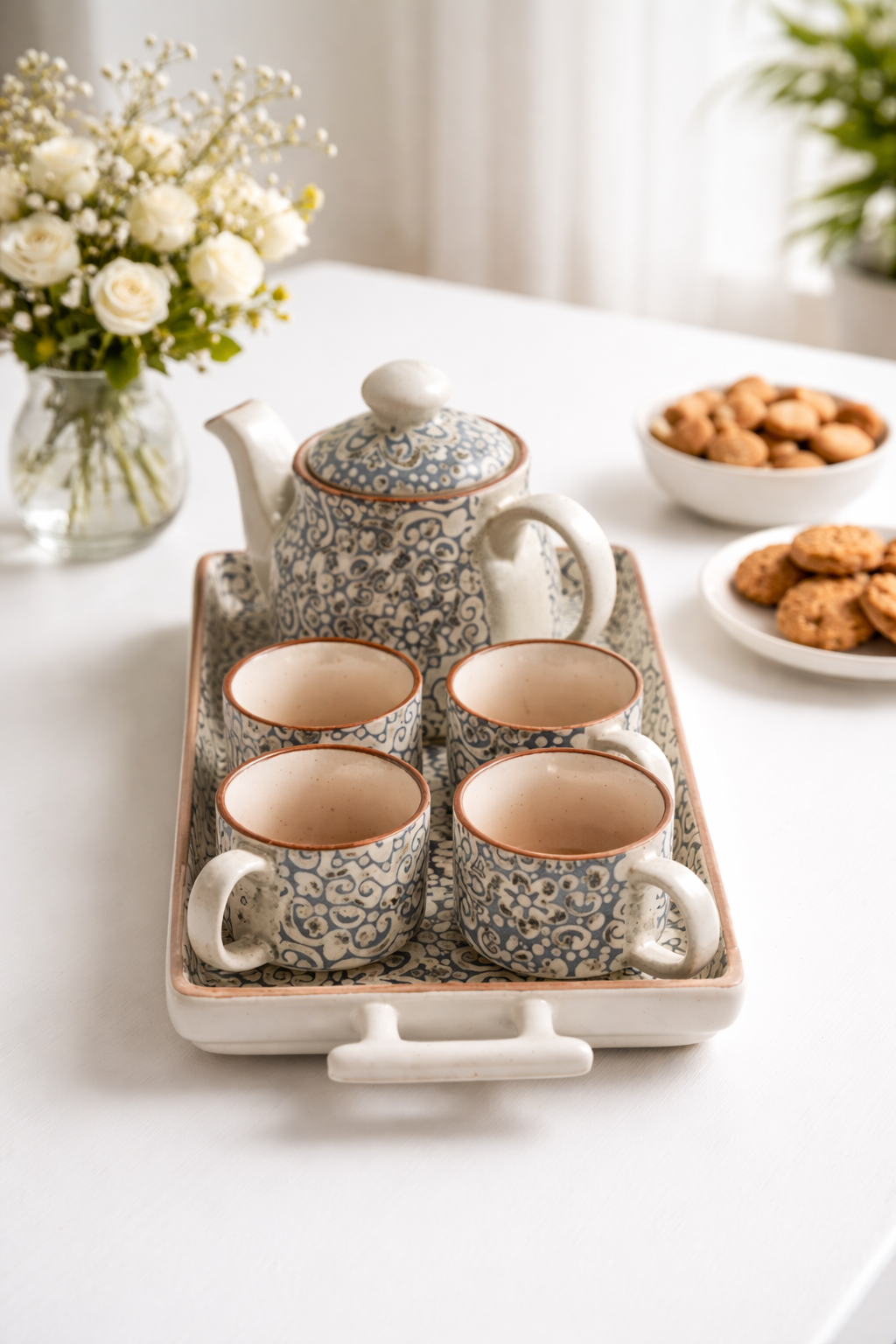 The intricate blue floral patterns paired with subtle earthy tones create a timeless aesthetic that blends seamlessly with modern, minimal, and classic interiors. The smooth ceramic finish ensures durability, while the thoughtfully designed tray keeps everything organized and easy to serve.