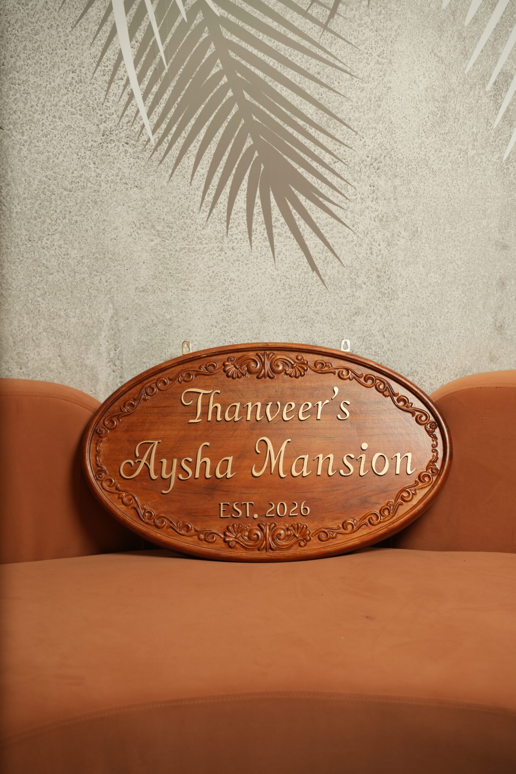 Create a warm and elegant first impression with this handcrafted wooden house name plate, designed to bring a touch of classic luxury and personalization to your home entrance. Featuring a rich wood finish with intricate carved borders and raised gold lettering, this name board beautifully showcases your house name with timeless appeal. The oval shape […]